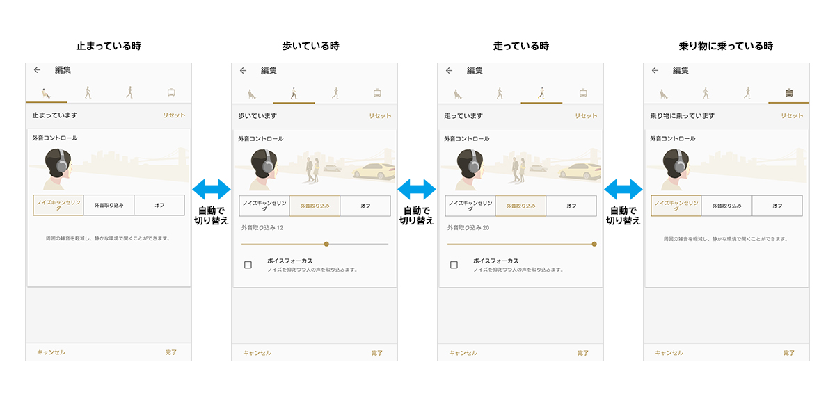 ペアリングしているスマートフォンの加速度センサーにより、止まっている時/歩いている時/走っている時/乗り物に乗っている時の4パターンの行動を検出。ユーザーの行動に合わせて、あらかじめ各パターンで設定しておいたノイズキャンセリング/外音取り込み設定やイコライザー設定に自動で切り替えてくれます。