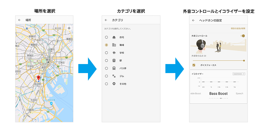 接続しているスマートフォンのGPS機能と連係し、AIがユーザーのよく行く場所を認識。自宅や職場などの頻繁に訪れる場所に合わせたノイズキャンセリング/外音取り込み設定やイコライザー設定を登録することで、次訪れるときには自動でお好みの設定に切り替わります。