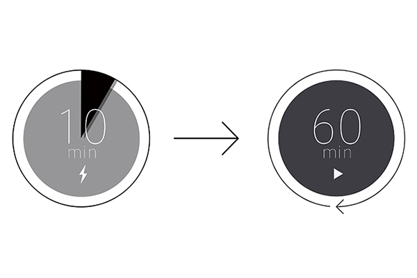 10分の充電で1時間再生が可能なクイック充電にも対応。突然の外出時に便利です。