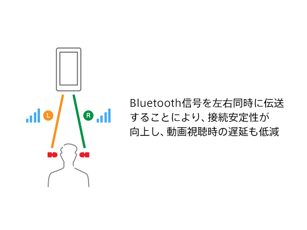 左右同時伝送接続により、本体の左右側それぞれがプレーヤーからのBluetooth信号を同時に伝送し、高い接続安定性を実現しています。また、動画視聴時の映像と音声のずれも低減しています。