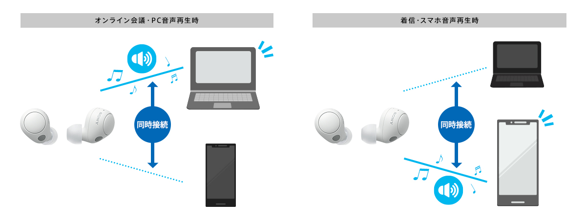 スマートフォンやPC等の機器の中から2台の機器と同時接続し、それぞれで通話も音楽も受信できるマルチポイント接続に対応。例えば、PCでオンライン会議を終了した後、スマートフォンで音楽再生を始めるだけで再生機器を切り替えられます。スマートフォンが電話を着信した際には自動でスマートフォンの通話に切り替わり、そのままハンズフリー通話をすることも可能。2台の機器でヘッドホンを使う場面で接続の切り替えがいらず、快適にご使用いただけます。