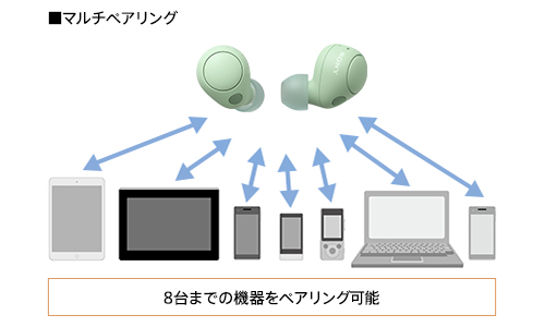 8台までの機器とペアリングできるマルチペアリングに対応。Androidでも、iPhoneでも、PCでも、よく使う機器と一度ペアリングしておけば、2回目からのBluetooth接続がかんたんになります。