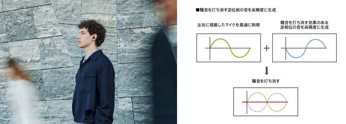 デュアルノイズセンサーテクノロジー新採用で、より高性能なノイズキャンセリングを実現しました。2つのセンサー(マイク)で集音した騒音と、プレイヤーの音楽信号をすべてデジタル化。DNC(デジタルノイズキャンセリング)ソフトウェアエンジンでは、フィードフォワード・フィードバックの2つの方式を統合し、騒音を打ち消す効果のある逆位相の音を高精度に生成。周囲のノイズを気にせず、静寂に浸って、高音質のコンテンツを楽しむことができます。