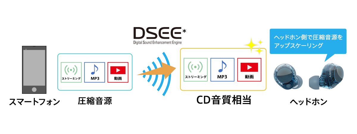 低音域から高音域までバランスいいクリアな音質で、幅広いジャンルの楽曲にも合う高音質を実現。また、ソニーの独自開発技術「DSEE」(*)により、圧縮された音源で失われがちな高音域をCD音質相当までヘッドホン内で補完します。
