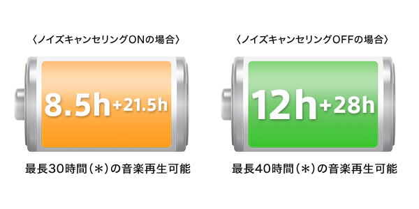 ノイズキャンセリングON時は本体最大8.5時間バッテリーと、ケース充電込で合計最大30時間(*)、ノイズキャンセリングOFF時は本体のみで最大12時間、ケース充電込で合計最大40時間(*)バッテリーが持続します。