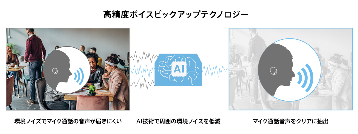 AI技術を活用した高精度ボイスピックアップテクノロジーが新搭載され、前モデルWF-C700Nよりクリアな通話性能を提供。複数のマイクを最適に制御し、高度な音声信号処理を行う高精度ボイスピックアップテクノロジーにより、高い通話品質を実現。5億サンプルを超えるAIの機械学習で構成された装着者の声とそれ以外の環境ノイズを分離するアルゴリズムによって周囲の環境ノイズを抑え、あなたの声をクリアに抽出します。