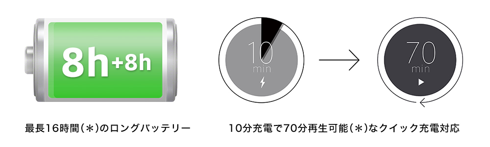 本体だけで最長8時間(*)の連続音楽再生が可能。さらに充電ケース1回充電で、合計16時間バッテリーが持続します。また、10分充電で70分再生可能(*)のクイック充電にも対応。突然の外出時も安心です。