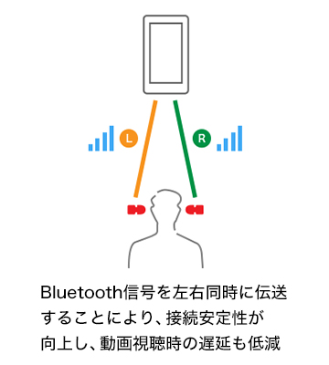 本体の左右側それぞれがプレーヤーからのBluetooth信号を同時に伝送する左右同時伝送方式を採用することで、接続安定性が大幅に向上しました。さらに動画遅延も大幅に低減しています。