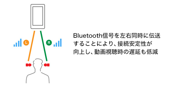 本体の左右側それぞれがプレーヤーからのBluetooth信号を同時に伝送することで、高い接続安定性を実現しています。また、動画視聴時の映像と音声のずれも大幅に低減されています。
