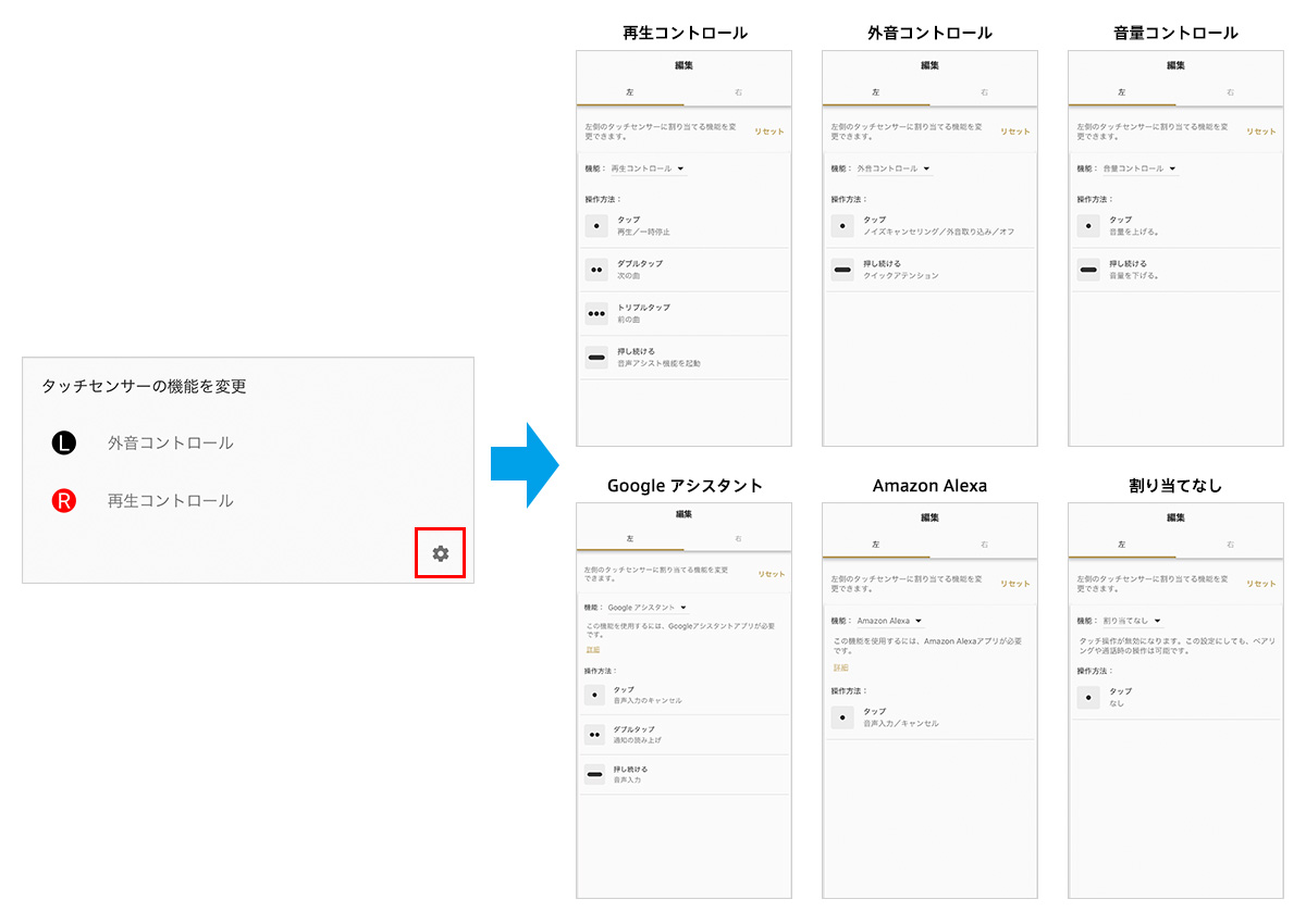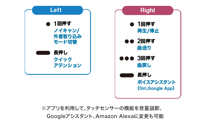 左右それぞれのタッチセンサーに割り当てる機能を自由に選択することが可能。音楽の再生/停止や、外音コントロール、音量調節、Googleアシスタント、Amazon Alexa、何も機能を割り当てない等の選択が可能です。