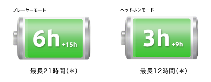 プレーヤーモード(Bluetooth OFF)は最大6時間、ヘッドホンモード(Bluetooth ON)は最大3時間の連続音楽再生が可能です。