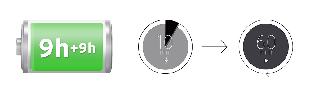 本体のみで9時間、ケース充電1回で合計18時間の長時間バッテリー搭載。また、クイック充電にも対応しており、10分の充電で60分再生可能です。
