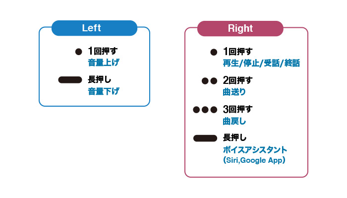 本体に搭載されたボタンにより、スマートフォンなどの音楽再生機の再生/一時停止、曲送り/曲戻し、音量の上げ下げ、さらには電話の着信を受けたり終話させたりなどの操作が可能。また、Siri(R)(*1)やGoogle(TM)アプリ(*2)といったスマートフォンの音声アシスタント機能の起動にも対応(*3)。