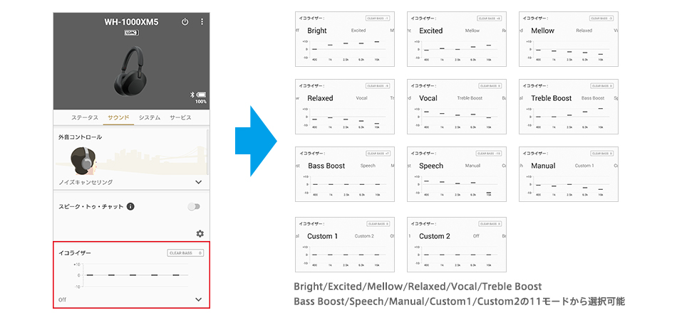 「Relaxed」や「Bass Boost」など8種類のプリセットから選択したり、お好みのイコライザー設定にカスタマイズしたりすることが可能です。