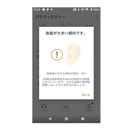 いつまでも楽しく音楽を聴き続けられるように、リスニング傾向が聴覚に配慮されているかを確認できる機能です。ヘッドホンで音楽視聴中の音圧(音の大きさ)が記録、蓄積され、世界保健機関(WHO)の推奨する限度と比較した結果が確認できます。また、その限度に近づいた時や超えた場合に通知を受け取ることができます。