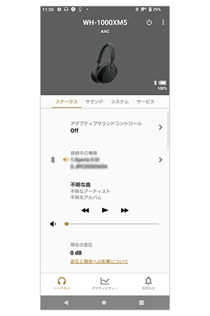 ヘッドホンのバッテリー残量、接続中のコーデック、DSEEのON/OFFなど、ヘッドホンの現在の状態を一目で確認できます。
