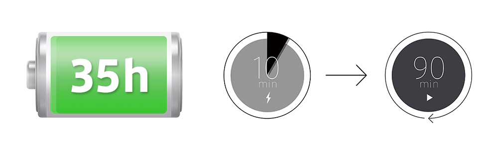 最大35時間再生のロングバッテリー。1日5時間聴いても1週間充電いらずです。さらに、10分の充電で90分の再生が可能なクイック充電にも対応。