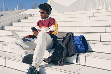 2台の機器と同時接続し、それぞれで通話も音楽も受信できるマルチポイント接続に対応。例えばスマートフォンで音楽を聴いた後、停止し、PCで音楽再生を始めるだけで再生機器を切り替えられます。スマートフォンが電話を着信した際には自動でスマートフォンの通話に切り替わり、そのままハンズフリー通話をすることも可能。2台の機器でヘッドホンを使う場面で接続の切り替えがいらず、快適にご使用いただけます。