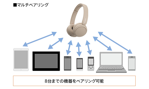8台までの機器とペアリングできるマルチペアリングに対応。よく使う機器と一度ペアリングしておけば、2回目からのBluetooth接続がかんたんになります。