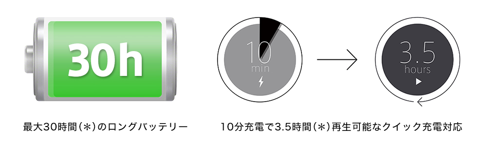 最大30時間(*)のロングバッテリーライフだから長時間の移動などでもバッテリーの事を気にせず、心ゆくまで音楽を楽しめます。さらに10分充電で3.5時間(*)の再生が可能なクイック充電にも対応。突然の外出時も安心です。