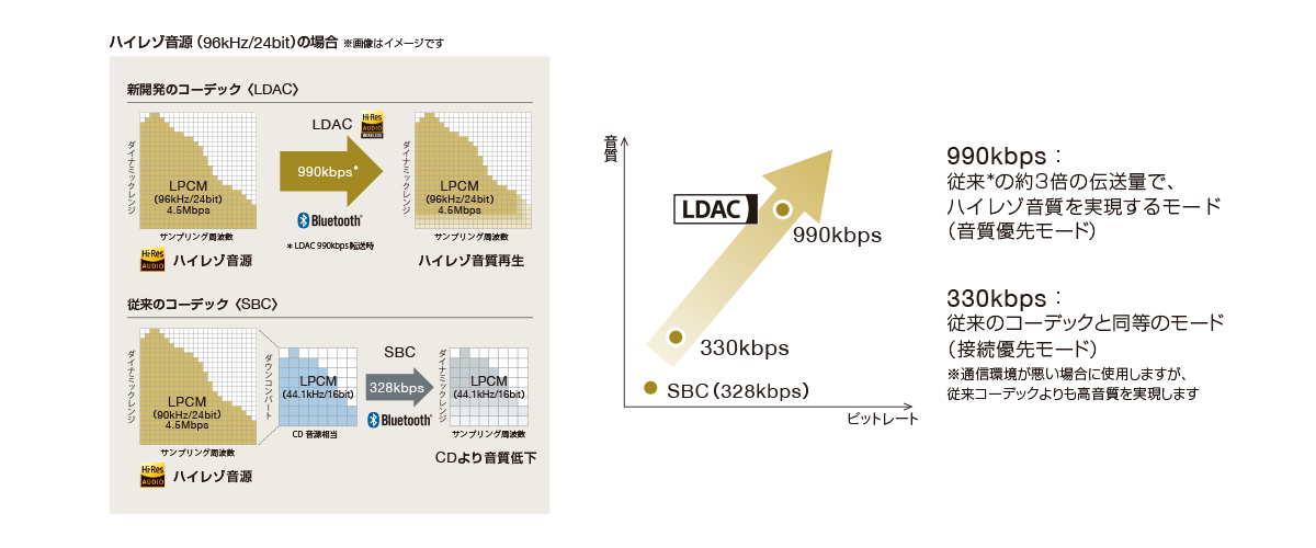 *1 LDACは日本オーディオ協会の”Hi-Res Audio Wireless”に認定されたコーデック技術です。ハイレゾコンテンツを転送速度990kbpsで伝送する場合