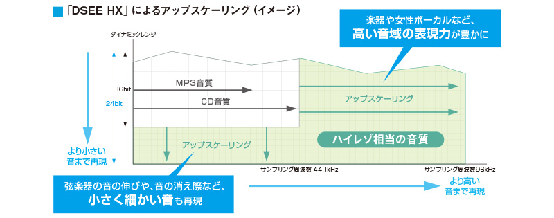 CD音源(44.1kHz/16bit)やMP3などの圧縮音源の高音域を補完するとともに、サンプリング周波数とビットレートを本来の数値より高めることで、ハイレゾ相当の音質(最大96kHz/24bit)に変換。ハイレゾ音源に対応していないスマートフォンや音楽プレーヤーでもハイレゾ相当のクリアで躍動感のあるサウンドを楽しめます。