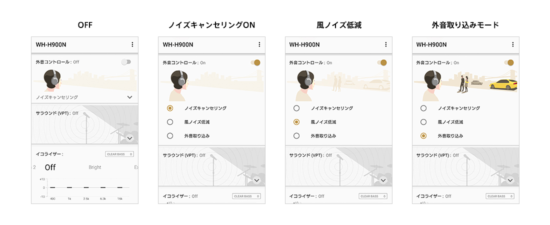ノイズキャンセリングのON/OFF、外音取り込みモード/風ノイズ低減モードの切り替えが可能。
