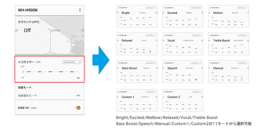 「Relax」や「Bass Boost」など8種類のプリセットから選択したり、お好みのイコライザー設定にカスタマイズしたりすることが可能です。
