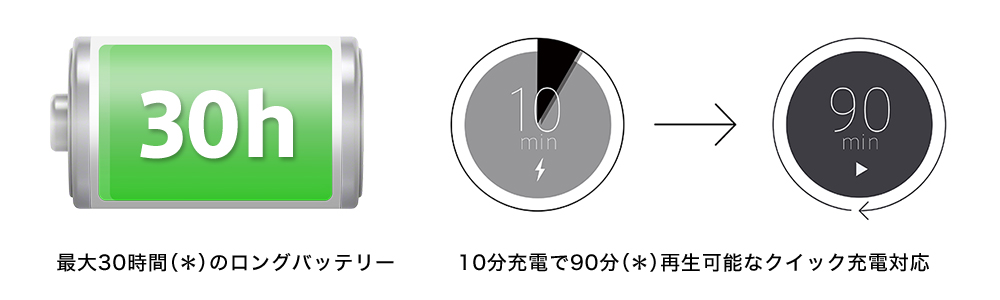* コーデックはAAC。DSEE/イコライザーの搭載モデルはOFF設定時、またその他機能は全て初期設定時。設定ごとの音楽連続再生時間は こちら をご確認ください