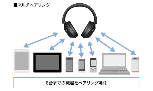 8台までの機器とペアリングできるマルチペアリングに対応。よく使う機器と一度ペアリングしておけば、2回目以降のBluetooth接続がかんたんになります。