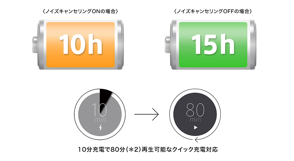 ノイズキャンセリングON時は最大10時間、ノイズキャンセリングOFFの場合は最長15時間の音楽再生が可能。突然の外出時に、10分の充電で80分再生(*2)が可能なクイック充電にも対応。