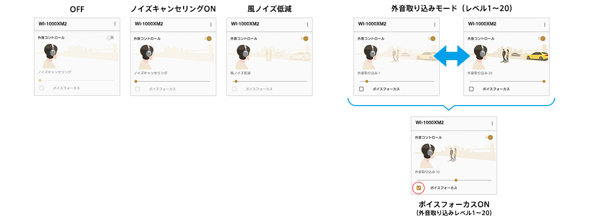 ノイズキャンセリングのON/OFFや、外音の取り込み方のレベルを22段階で調整可能。さらに、ボイスフォーカスをONにすることで、周囲の音を取り込みながらもノイズは低減し、人やアナウンス音のみを聞きやすくすることも可能です。自分の好きな外音取り込みのレベルに設定できるので、シーンに応じて快適に音楽を楽しむことができます。