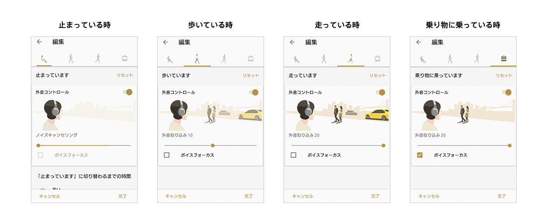 ペアリングしているスマートフォンの加速度センサーにより、止まっている時/歩いている時/走っている時/乗り物に乗っている時の4パターンの行動を検出。ユーザーの行動に合わせてあらかじめ各パターンで設定しておいたノイズキャンセリングや外音取り込みのモードに自動で切り替えてくれます。