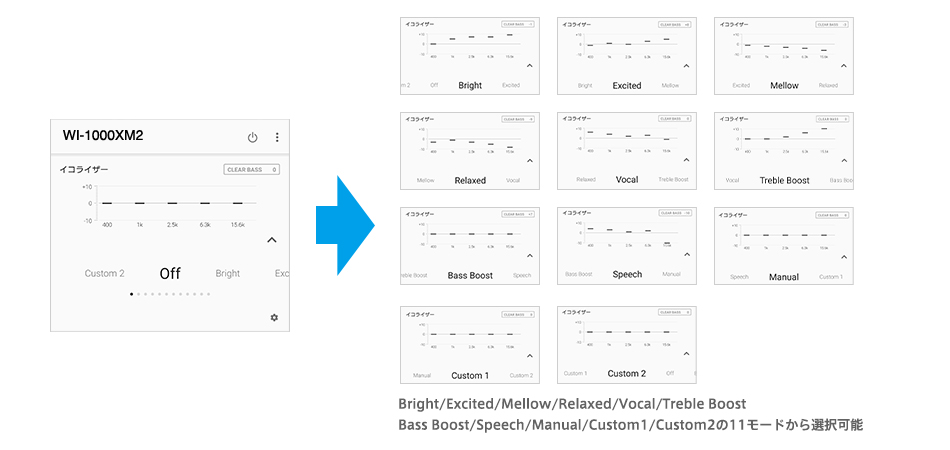 「Relaxed」や「Bass Boost」など8種類のプリセットから選択したり、お好みのイコライザー設定にカスタマイズしたりすることが可能です。