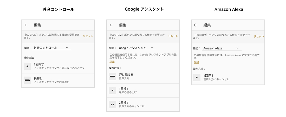 ノイズキャンセリングの気圧に応じた最適化、音質モードの切り替え、DSEE HXのON/OFF、装着していない場合の自動電源OFFの設定の変更、通知音と音声ガイダンスの言語の変更などの操作が可能です。