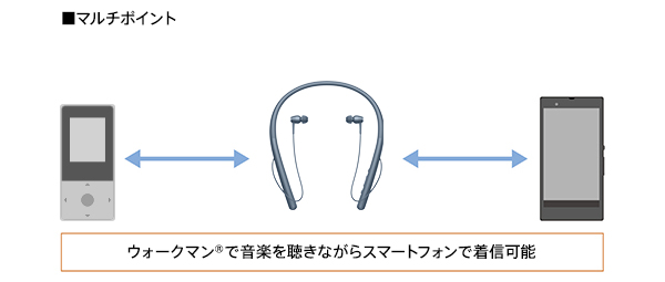 ウォークマンなどの音楽再生機器(A2DPプロファイル)とスマートフォンなどの通話機器(HFPまたはHSPプロファイル)、それぞれ1台ずつに同時接続できるマルチポイントにも対応。例えばウォークマン(R)で音楽を聴いている最中に、スマートフォンにかかってきた電話を着信してそのままハンズフリー通話をすることも可能。スマートフォンとウォークマン(R)の2台持ちに便利です。