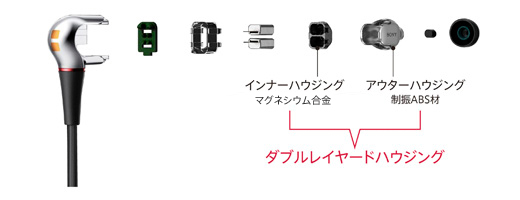 インナーハウジングには、高内部損失かつ高剛性な素材である高品質なマグネシウム合金を、アウターハウジングには筺体内の共振を抑える制振ABS素材を採用。ユニットをインナーとアウターの異なる素材の二重構造ハウジングで固定することで、歪み(ひずみ)が少なくクリアな中高音を実現します。