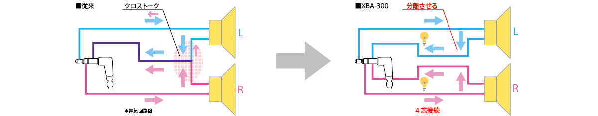 4芯構成により左右のセパレーションを改善し、クロストークを低減。音の広がりと引き締まった低音を楽しめます。
