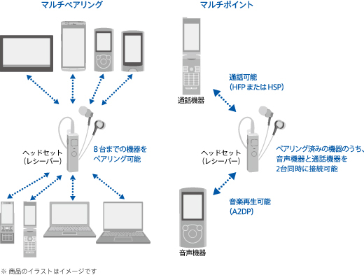 8台までの機器をペアリングすることができるマルチペアリングと、音楽再生機器(A2DPプロファイル)と通話機器(HFPまたはHSPプロファイル)に、それぞれ1台ずつ同時に接続可能。