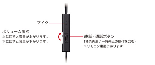 リモコンに通話・終話ボタンとマイクを内蔵。スマートフォンでハンズフリー通話が可能です。さらに、ボリューム調整や音楽再生/一時停止もできるので、スマートフォンで音楽を聴くときも便利です(*)。