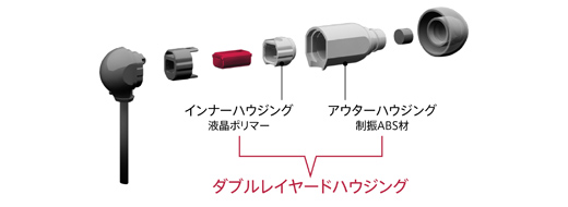 インナーハウジングには、高内部損失かつ高剛性な素材である液晶ポリマーを、アウターハウジングには筺体内の共振を抑える制振ABS素材を採用。ユニットをインナーとアウターの異なる素材の二重構造ハウジングで固定することで、歪み(ひずみ)が少なくクリアな中高音を実現します。