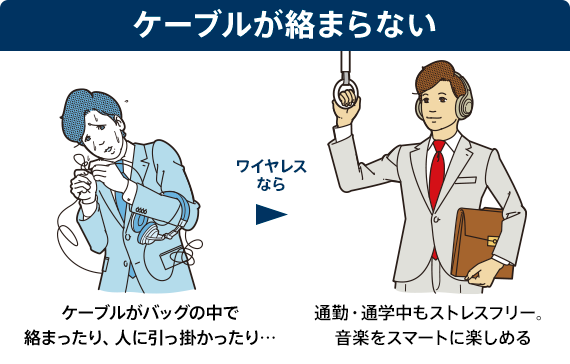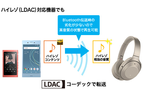 LDAC対応機器との接続なら、ハイレゾコンテンツを従来のBluetooth® Audioの最大約3倍(*)の情報量で伝送できるので、ハイレゾコンテンツも劣化することなく存分にいい音でお楽しみ頂けます。