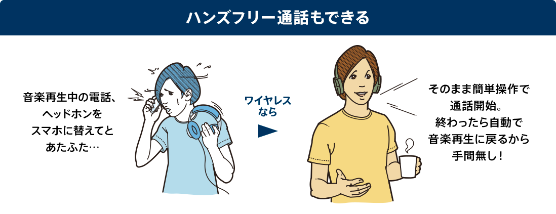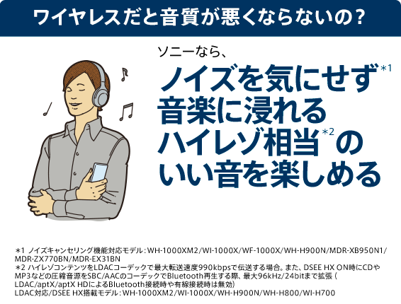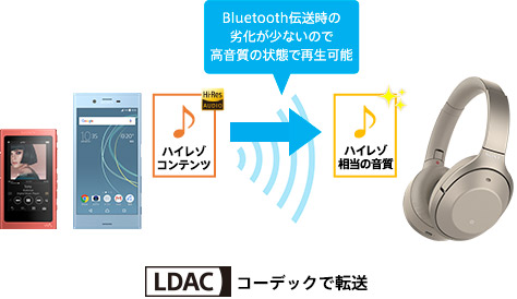 Xperiaはハイレゾ・オーディオ伝送技術「LDAC」に対応しているので、ワイヤレスでもハイレゾコンテンツをいい音で存分に楽しめます。
