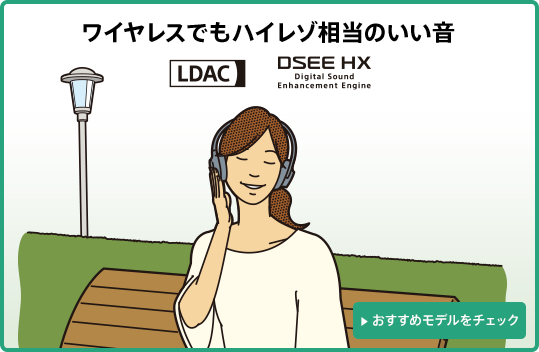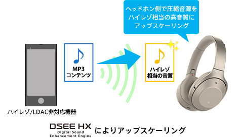 DSEE HX機能搭載なので、ハイレゾ音源やハイレゾ対応の端末を持っていなくても、CD音源やMP3などの圧縮音源の高音域を補完するので、ハイレゾ相当のいい音を楽しめます。