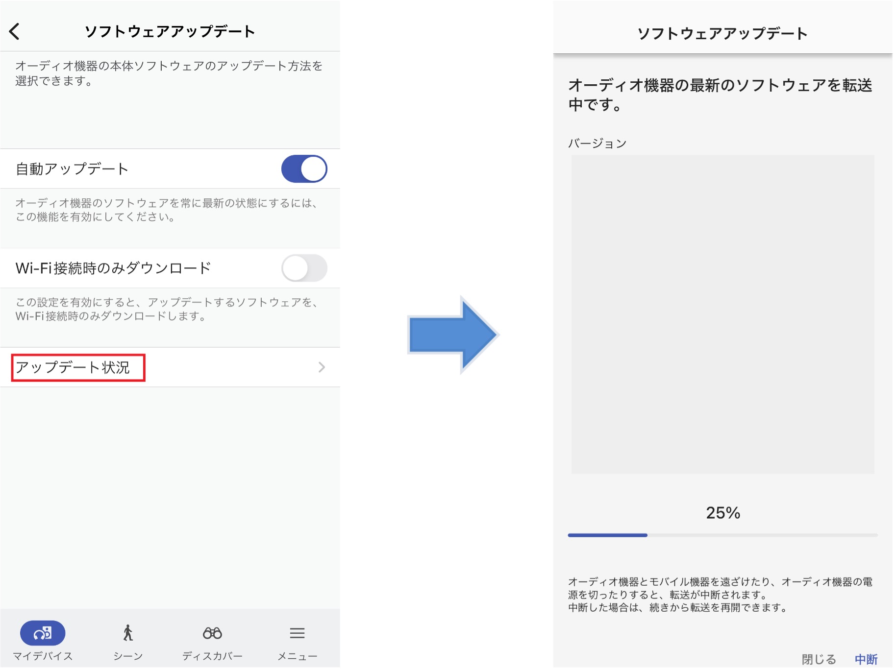 ソフトウェアの転送が完了すると、自動的に「オーディオ機器のソフトウェアをアップデートしてください。」と表示されます。