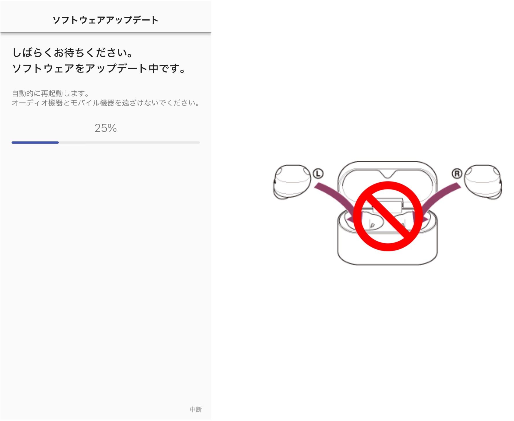 - アップデート用ソフトウェアアップデート実行中は、「本体を充電ケースに挿入」したり、「電源OFF」を絶対にしないでください。これらの操作をしてしまいますと、本機が使用できなくなることがあります。