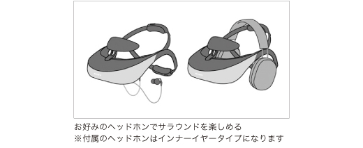 お気に入りのヘッドホンで本機を楽しみたい方のために、ヘッドホン端子を装備しました。また、インナーイヤータイプとオーバーヘッドタイプのそれぞれの特性に合わせたサラウンドモードも選択できます。