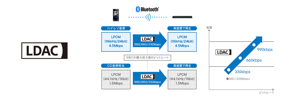 *2 Bluetooth A2DPのSBCとの比較。ハイレゾコンテンツを転送速度990kbpsで伝送する場合