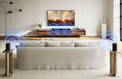 オプションリアスピーカーと接続時、ステレオ音声をフロント・リアスピーカー双方から再生することで、部屋中を音で満たし音に包まれる贅沢なリスニング空間をつくり出します。全身に響き渡るパワフルなサウンドが、日常の視聴シーンをダイナミックな迫力で引き立てます。