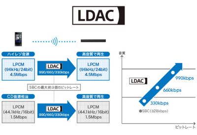 *1 LDACは日本オーディオ協会の“Hi-Res Audio Wireless”に認定されたコーデック技術です *2 Bluetooth A2DPのSBCとの比較。ハイレゾコンテンツを転送速度990kbpsで伝送する場合